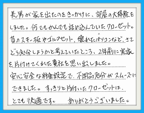 誠心誠意、一生懸命 老人ホーム入所のための実家の片付け、 故人様の遺品整理片付けのお手伝いをさせていただき、 少しでもご家族様の心の負担が和らいでいただけることを心から願っております。