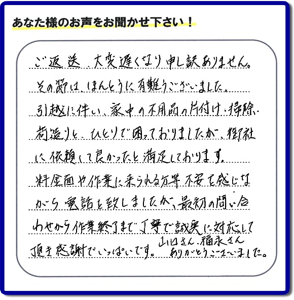 「帰省せず、電話だけで実家の片付けが済んだので、大変ありがたかった。」「会社を休まずに実家の片付けが終わって良かった。」「時間も拘束されず、交通費、宿泊費もかからず助かった。」といったお礼の言葉をご家族様からいただいています。