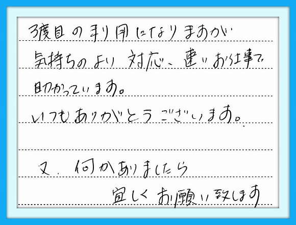 リピーターのお客様より メッセージをいただきました。 今回で3回目になりますがいつも 通り手早く丁寧に作業をしていただ きました。ありがとうございました。 また、よろしくお願い致します。